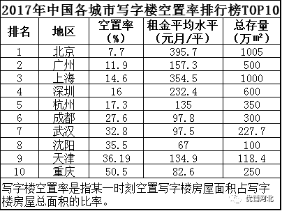 2017年中国各城市写字楼空置率排行榜TOP10