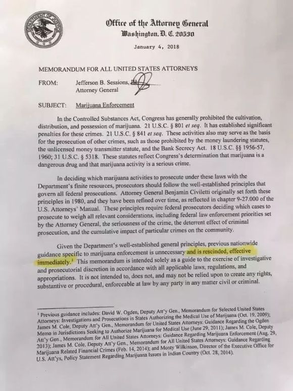 奥巴马时期“不干预州政府,将大麻合法化”的做法将被彻底撤销。联邦法规定:全美范围内禁止人民拥有、种植和出售大麻。