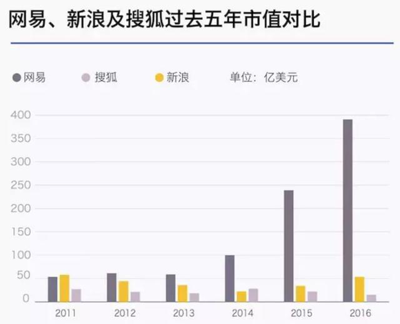 如今的腾讯坐拥第一的社交和游戏平台,新浪除了门户外,重要的依靠是微博。而网易的300亿美元市值主要依靠游戏,同时试图将旗下新闻、音乐等服务导向其新业务——电商平台。搜狐靠着视频和培育出的搜索业务(搜狗),还在不断转型中。