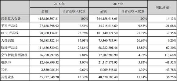 汉王科技2016年主营业务收入按产品划分(元)(据年报)