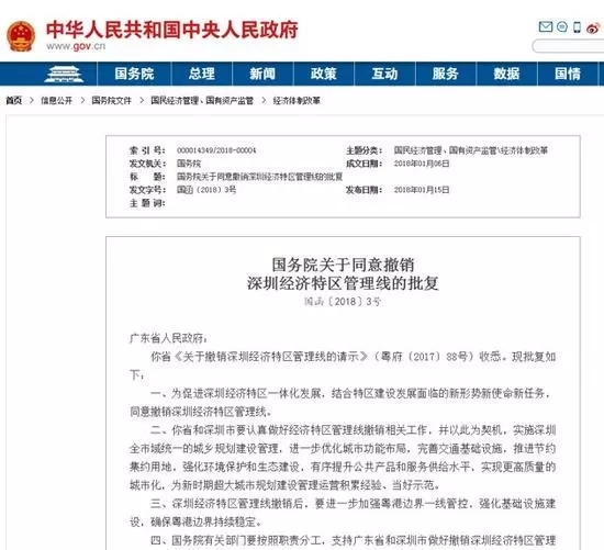 1月15日,记者从中国政府网获悉,国务院发函广东省人民政府同意撤销深圳经济特区管理线。《国务院关于同意撤销深圳经济特区管理线的批复》中说,为促进深圳经济特区一体化发展,结合特区建设发展面临的新形势新使命新任务,同意撤销深圳经济特区管理线。
