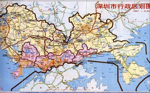 深圳地图上的粉色部分为原关内范围,黄色部分为原关外范围