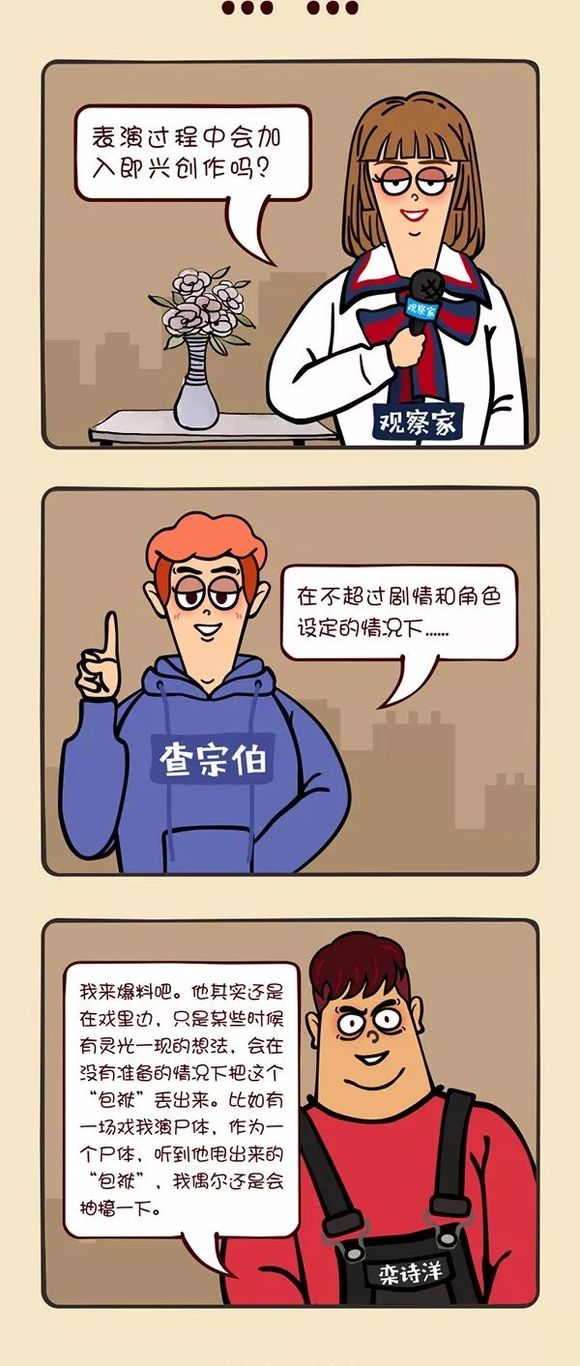 观察家:您在《开心麻花》出演的话剧都是配角,有一场还是演尸体,您怎么看待这种奉献型角色问题?您觉得作为一名话剧演员,应当具备怎样的职业操守?