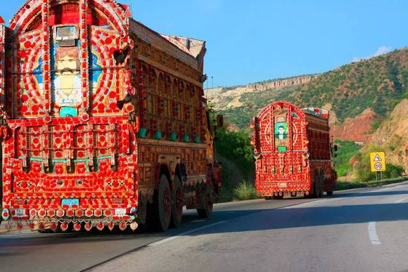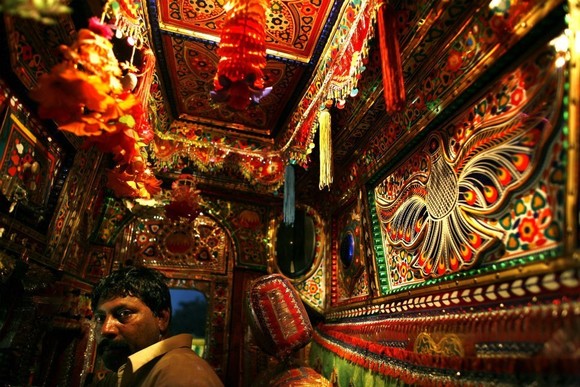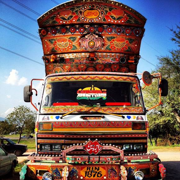将交通工具绘满各色图案是巴基斯坦人骨子里的热情外露,如今它已经变为一种特殊巴基斯坦民族艺术。每一辆车都精心装饰,像是创造一个移动的家,“一生中大部分时间都在驾驶室度过,所以当然要把它装饰得漂漂亮亮”,长途卡车车主们这样说。