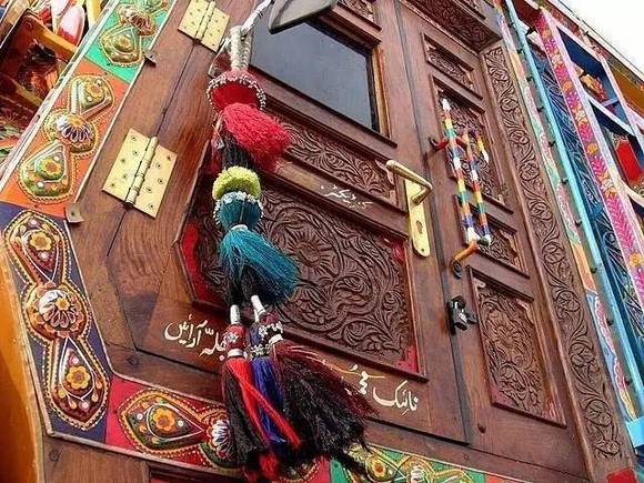 雕有精美图案的木门也是巴基斯坦卡车的典型装饰之一。车主们很少使用塑料和捶打的金属制品,车门、车顶和后视镜都要按最新潮流增添装饰,因此会磨镜子的技师、艳丽的烧彩边框铜镜在巴基斯坦很受欢迎。