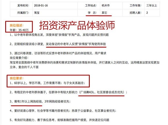 1月16日,淘宝发布了一则招聘两名“资深产品体验师”的信息,年薪35到40万。没有学历要求,工作背景不限。只要年龄在60岁以上,至少有一年网购经验,如果碰巧还是广场舞界一枝花就更好了。