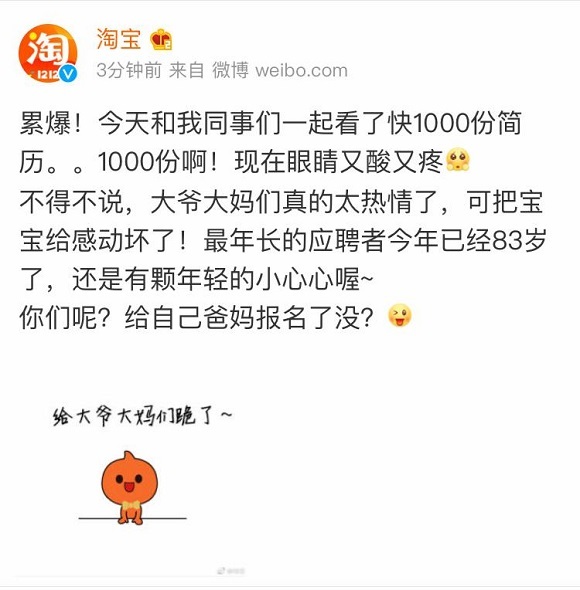 虽然目前淘宝方面并没特别说明针对即将新加入的老年员工将有什么特殊工作安排政策,但从其工作内容介绍来看,至少弹性化的工作时间并不难办到。