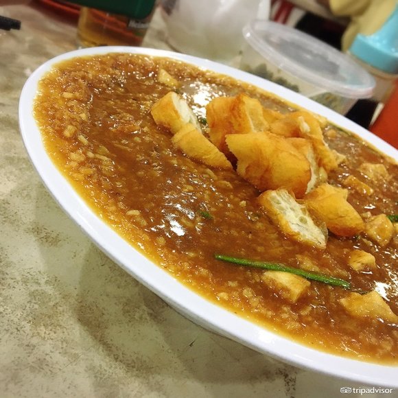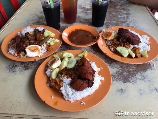 扁担饭是早期槟城小贩的叫法,勤劳的人们会将米饭和各种咖喱吊在扁担的两端,在码头、工地兜售。这道菜的配料主要有猪肉、鸡肉、鱼肉和蔬菜。制作的时候需要把红、青、白、黄的咖喱分别放到锅里煮,并将椰浆倒进去,以减少辛辣味,增加香味,使得咖喱的味道很平和,最后放上配菜煎鱼肉,充满南洋风味。这蘸有咖喱的扁担饭,感觉鲜辣中又带有一些香甜,十分美味。