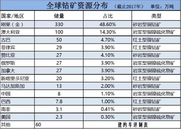 在全球700 万吨的陆地钴矿储量中,其中刚果(金)一国就占340 万吨,折合全球总储量比例48.6%,排在之后的是澳大利亚、古巴、赞比亚、俄罗斯、加拿大等国。