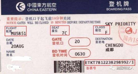所有信息都是可以在登机牌中看到的,具体例子如下:
