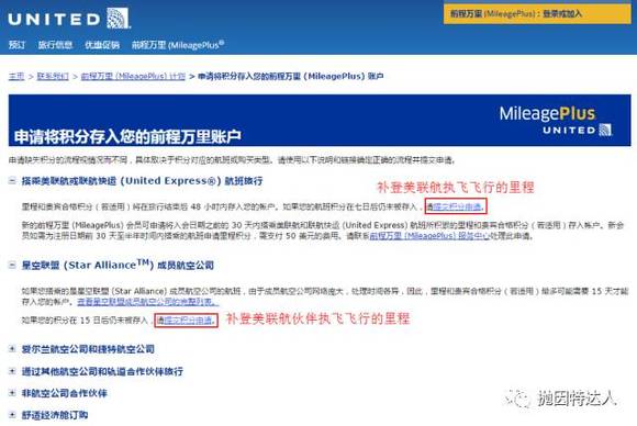 一旦有了相关信息了,遍可以到要攒入里程的航司官网补登里程,如图例子为美联航补登里程页面: