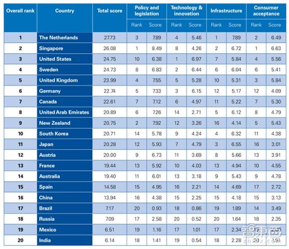 毕马威针对20个国家自动驾驶成熟度进行了排名,美国第三,中国第16。