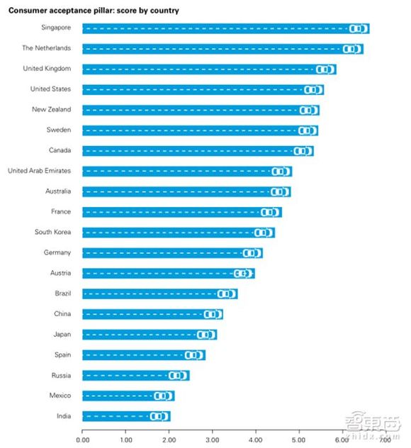 毕马威针对20个国家的自动驾驶相关政策(Policy &legislation)、技术创新(Technology &innovation)、基础建设(Infrastructure)、消费者接受度(Consumer acceptance)进行了评估,并进行了排名,前五的有荷兰、新加坡、美国、瑞典和英国,中国排名16(考虑了人均),巴西垫底。