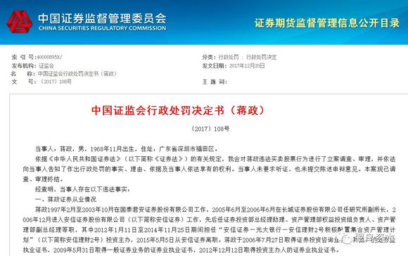 上周末,证监会的一个处罚刷屏了,就是前安信证券资管副总蒋政在2014年11月26日至2015年5月4日期间,违规买入股票金额合计4.7亿元,获利5.3万元,遭证监会罚没16万元,同时,蒋政被罚5年证券市场禁入,在禁入期间内,不得从事证券业务或者担任上市公司董事、监事、高级管理人员职务。初看这个新闻,大多数人都会觉得这个就是一个例行的处罚而已,但是翠鸟资本却认为这个案子并没有那么简单,抛开处罚过轻不说,至少有3处存疑。
