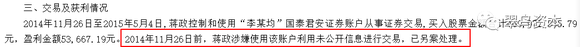 从证监会处罚决定书里还可以看到这么一句话:“2014年11月26日前,蒋政涉嫌使用该账户利用未公开信息进行交易,已另案处理。”