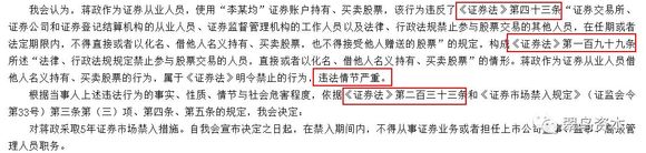 证监会的处罚决定书是这么说的:“我会认为,蒋政作为证券从业人员,使用“李某均”证券账户持有、买卖股票,该行为违反了《证券法》第四十三条“证券交易所、证券公司和证券登记结算机构的从业人员、证券监督管理机构的工作人员以及法律、行政法规禁止参与股票交易的其他人员,在任期或者法定期限内,不得直接或者以化名、借他人名义持有、买卖股票,也不得接受他人赠送的股票”的规定,构成《证券法》第一百九十九条所述“法律、行政法规规定禁止参与股票交易的人员,直接或者以化名、借他人名义持有、买卖股票”的情形。蒋政作为证券从业人员借他人名义持有、买卖股票的行为,属于《证券法》明令禁止的行为,违法情节严重。”