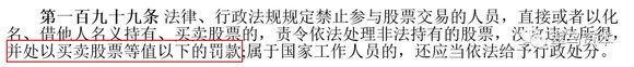 《证券法》第199条提到:“法律、行政法规规定禁止参与股票交易的人员,直接或者以化名、借他人名义持有、买卖股票的,责令依法处理非法持有的股票,没收违法所得,并处以买卖股票等值以下的罚款;属于国家工作人员的,还应当依法给予行政处分。”