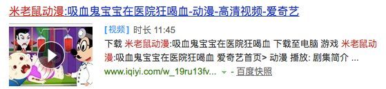 近日大量“邪典视频”流入中国,不论你是在百度、搜狗、谷歌,还是在腾讯、爱奇艺、YouTube,只要搜索你想看的《小猪佩奇》、《米老鼠》等热门动画片,总能搜出一堆奇怪的儿童色情暴力动画片。