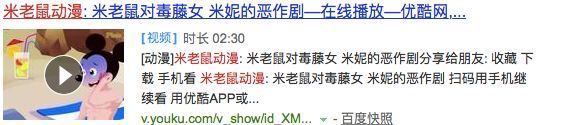 不止小猪佩奇,百度上输入“米老鼠动漫”也能搜到一堆乱七八糟的东西,什么米奇怀孕、出轨小三劈腿、狂喝血等小孩承受范围之外的成人情节,点开就能看: