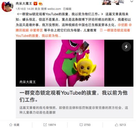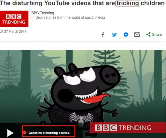 2016年,YouTube上突然集中爆发出大量儿童不宜的动画片,情节恐怖、色情又荒诞,BBC等主流媒体2017年3月直接发文批评: