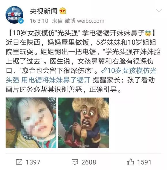 10岁女孩模仿光头强用电锯锯开妹妹鼻子