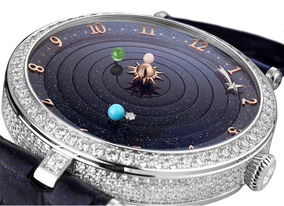 深蓝色砂金石表盘上,白色水星是珍珠母贝,绿色金星是珐琅,淡蓝色地球是绿松石,而月亮则是钻石,它们都按照真实周期运转。