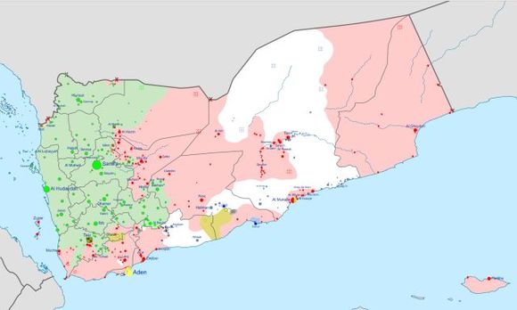 红色为也门哈迪政府与沙特多国联军控制