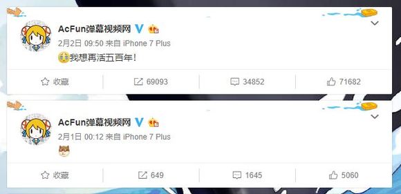 2月2日那天,AcFun的官博发布消息:“我想再活500年”,并配上哭泣的表情,充满了无奈,像是对最近传闻的回应。也暗示A站的前景危险,甚至超出外界预期。