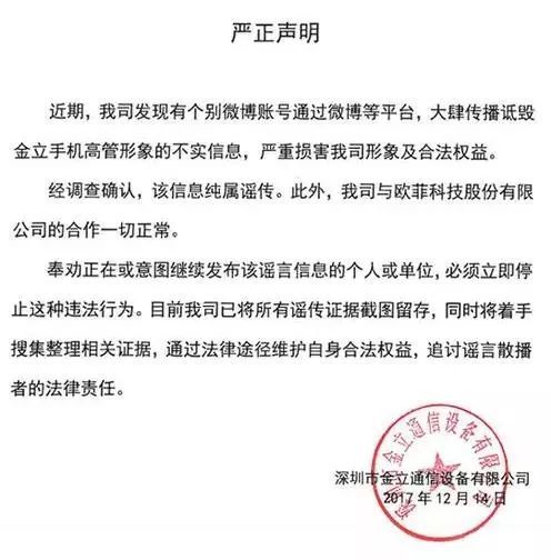 去年12月中,金立通讯设备发表了一份《严正声明》,称个别微博账号“大肆传播诋毁金立手机高管形象的不实信息”等等。而此前,“赌徒” 刘立荣的传闻四处发散,网上称其在澳门赌钱,“一夜输了几个亿”。