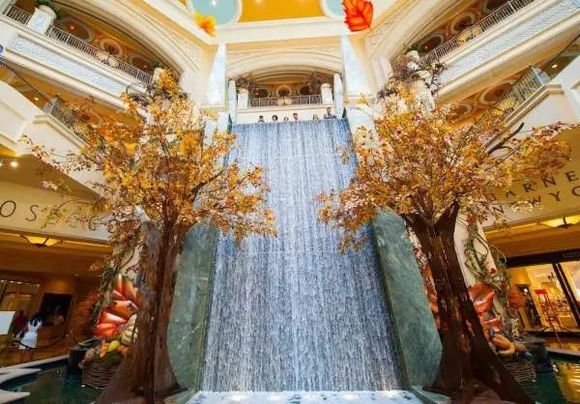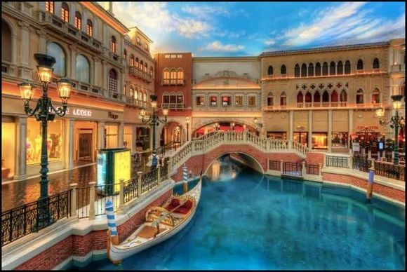 威尼斯人酒店国内的读者可能比较熟悉,澳门也有。相比凯撒宫它建得比较晚——1999年才建成。整个楼群的外观风格来自于水城威尼斯的多个建筑,也营造有水道系统,可以乘坐贡多拉游览。而内部也有类似的室内仿室外购物街。