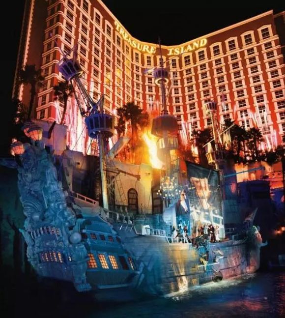 金银岛酒店,以酒店前的大海盗船为标志,晚间每一个半小时有《Sirens of TI》金银岛海妖表演: