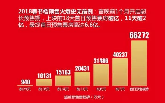 不仅是《捉妖记2》,《唐人街探案2》、《红海行动》等6部春节档大片都纷纷提前做了预售。猫眼数据显示,今年春节档预售是提前一个月开始的,上映前18天首日预售票房破亿,11天破2亿,最终首日预售票房高达6.6亿。