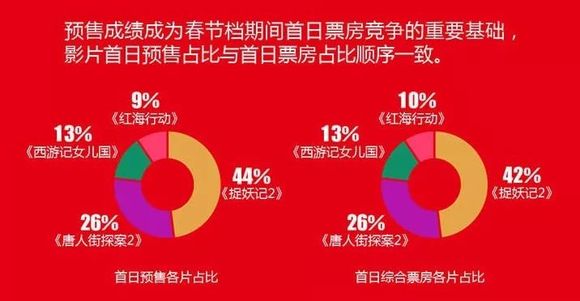 并且,猫眼研究院于初二发布的《大年初一电影市场消费大数据》还指出,预售成绩成为春节档首日票房竞争的重要基础。其中《捉妖记2》的预售票房占到了初一票房的44%,《唐人街探案2》占到了26%。