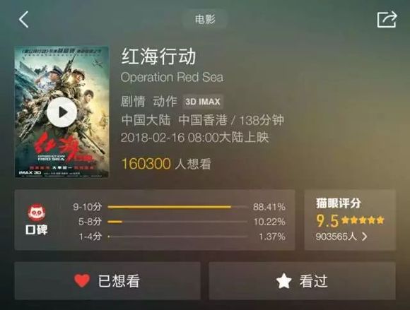 作为《红海行动》的联合发行方,猫眼平台在这场口碑发酵引领的票房逆袭中发挥了关键作用。目前猫眼上已经有90万人参与了《红海行动》的评分,猫眼评分在以每天平均10万条的速度增加,猫眼评论数更是激增到36万,电影口碑的马太效应逐渐成形。