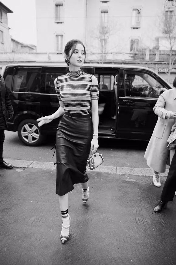 黑色铅笔皮裙则勾勒出完美身材~