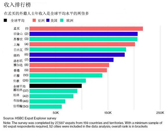 把钱给到位是抢人时最基础的要素。汇丰银行在调查了全球150多个国家和地区超过2.75万海外移居者(18岁以上)后发现,全球各大城市中,印度孟买对外籍员工最大方,其次高薪的是美国旧金山以及瑞士苏黎世。当全球外派员工平均年收入约10万美元时,到孟买上班的外籍人士的均收入就是这个数字的两倍多了(约21.72万美元,即137万元)。