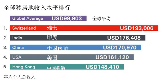在中国的外籍人士中,有一半表示他们在这里获得新技能的机会比在自己国内的还要多,而且约17.1万美元的年收入也要远高于全球平均水平(10万美元),仅次于瑞士、印度排世界高薪榜第三。事实上,外派中国的员工中有1/4的人年收入超过20万美元,超过半数(55%)人可以比在家乡攒更多钱用于储蓄或投资。