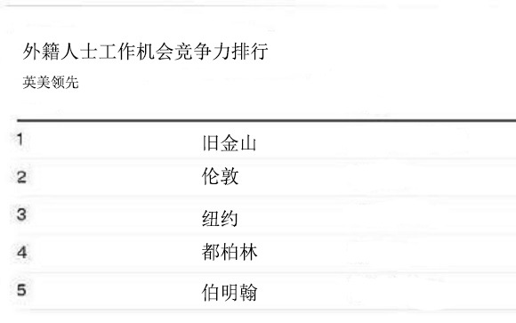 哪怕从经济方面来讲,细分到职业发展,虽然在上海工作的外籍人士拿得钱很多,但正如汇丰外汇主管Blackburn所说,美、英的金融和技术中心对于雄心勃勃的外籍人士来说仍是最具吸引力的。反映到工作机会竞争力排名上,上海还是落后于旧金山、伦敦、纽约、都柏林、伯明翰等城市。