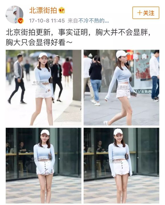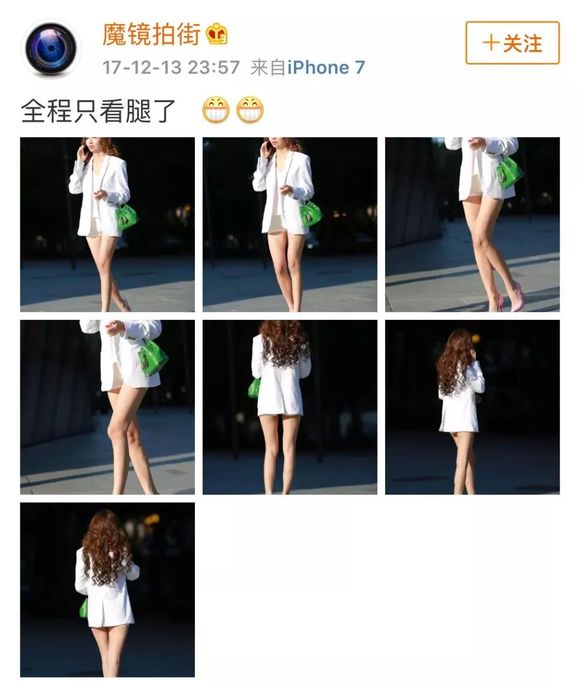 对待腿长的女性,尤其是夏装的街拍,博主会说,美腿小姐姐穿什么都好看,美腿就是一道风景,看不够的美腿……然后用九张图不同角度拍摄别人的腿。