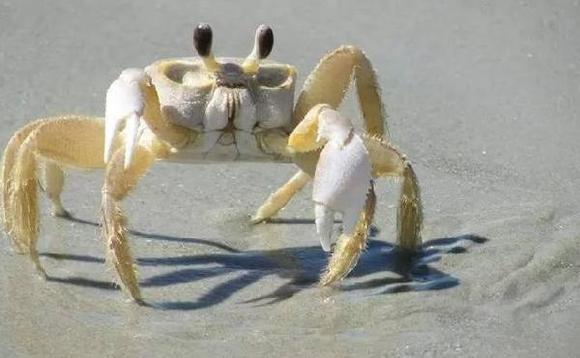 和尚蟹,全名短指和尚蟹,又名和尚蟹、兵蟹、海珍珠或北海沙蟹。生活在潮间带沙土的地道中,退潮时才出来活动。与普通螃蟹不一样的是,这种蟹可以向前走,挖沙方式像拧螺丝一样。而且雌雄蟹外表完全没有区别,食用时需要打开腹部才能区分,广西流行的沙蟹汁就是用和尚蟹做的。