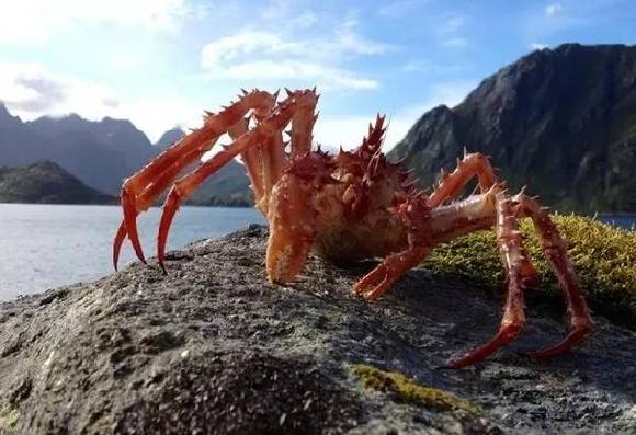 挪威罗弗敦群岛野生蟹王。罗弗敦群岛是挪威北部、挪威海中的群岛,岛上多沼泽、山丘,壮观的罗弗敦群岛是由上古的冰川雕琢而成的,一道峡湾把它和挪威大陆隔离了开来,把它孤零零留在了辽阔的海上。