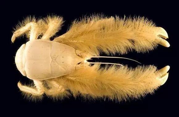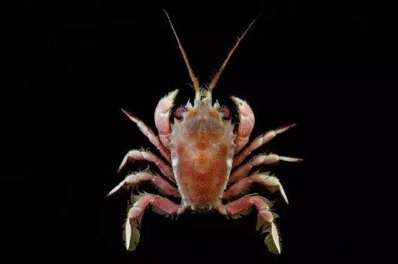 “雪人蟹”完全没有视觉功能,身上布满了黄色的细菌群落,螯上覆盖着头发般细细的绒毛,全身雪白,体长15厘米。生活距南太平洋复活节岛1500公里附近的深海。