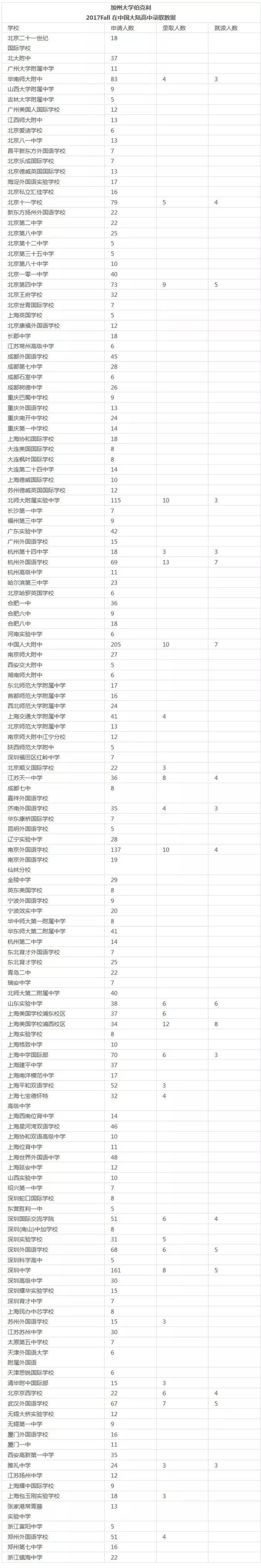 加州大学系统(University of California)每年都会公布每一所分校详细的录取数据,包括申请人数、录取人数、就读人数,申请学生生源高中,甚至细致到全球每一所高中的申请人数、录取人数和就读人数。