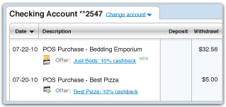 另外,直销银行提供极有市场竞争力的储蓄利息外,还能给予用户高额的积分回馈。如ING Direct澳大利亚刷卡消费平均反馈比例为2%。而BOFI则提供另外一种积分奖励模式--利用合作伙伴Cardlytics的解决方案,根据用户以往的刷卡消费记录推荐相应的现金反馈(如下图)。如用户昨天在必胜客消费过,用户电子账单该条消费明细下方则马上会出现"棒约翰消费返利10%"。当用户点击这条记录后该Offer就自动下载至用户的信用卡账户,用户下次在棒约翰刷卡消费便可以自动获得10%现金回馈。这样的解决方案又增加了用户接触直销银行频率。