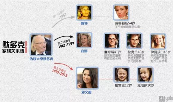 默多克是所有传媒家族中最为大家熟悉的,默多克一边执掌着堪称全球最大的媒体帝国,另一边自己的家事也是最受全球媒体关注的焦点之一。时至今日,默多克家族的传媒帝国已经涵盖电影、电视节目的制作和发行,无线电视、卫星电视和有线电视广播,报纸、杂志、书籍出版以及数字广播等。这个庞大的帝国无时无刻不在影响着全球无数人的思考和决定。对默多克家族而言,传媒就是一条通往财富和权力的捷径。