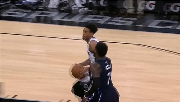 此节中还有一个是属于马刺队体系特征的,当米尔斯在对手的一次发球中,直接断球成功,传到内线后的米尔斯赶紧跑位到三分线外寻求空位机会,果不其然接到内线位置上球员的突分,米尔斯接球之后,成功完成一次三分得分。
