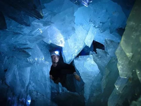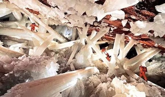 墨西哥巨型水晶洞,位于地下290米深处。洞内到处都是壮观的发光巨型石柱,直径4英尺,长度达到50英尺。洞内的巨型石膏晶体在数十万年时间里,一直以极其缓慢的速度生长着。含矿物成分的高温水冷却过程中,因石膏饱和而结晶析出。