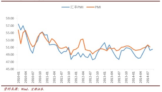 同样的情况出现在2014年3月,当官方PMI在2月见底,确立向上的趋势之后,汇丰PMI却是先向下,然后进行大幅度的修正,从5月开始到7月,连续三个月修正超过3.6个百分点。