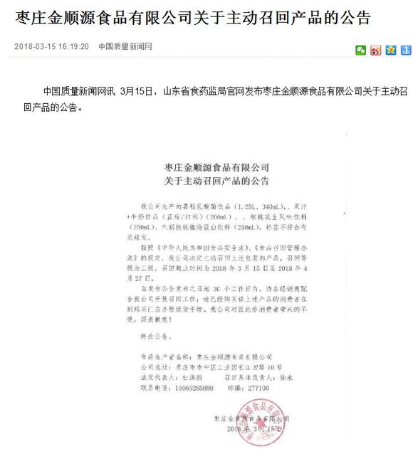 今天下午,山东省食药监局发布被“点名”三家公司之一的枣庄金顺源食品有限公司关于主动召回产品的公告。
