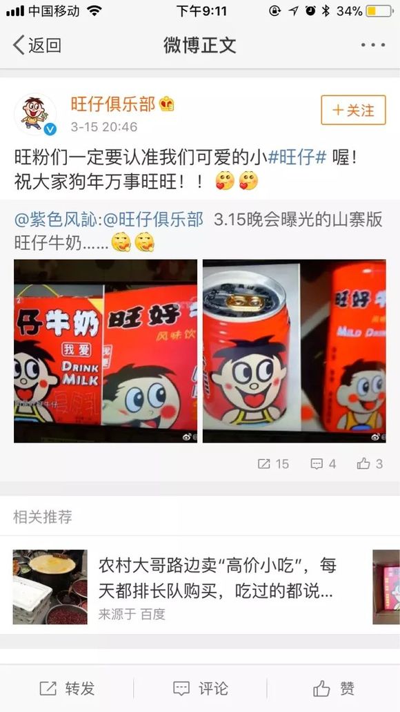 20:46,旺仔就在微博上转发了3.15曝光的山寨版旺仔牛奶,并“卖萌”呼吁:旺粉们一定要认准我们可爱的小#旺仔#喔!